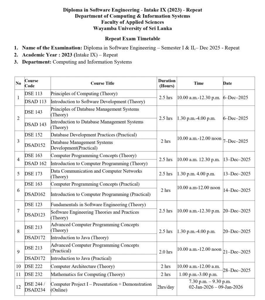 - LMS access to the previous courses will be granted and you are advised to submit any missing assignments to your repeating subjects. If you are from DSE Intake 1 to 8 and you do not have access to DSE 9 courses, Please send an email to sa.cmis+dse@wyb.ac.lk with the subject: “DSE Repeat Examination – Dec 2025”, including your full name and index number.