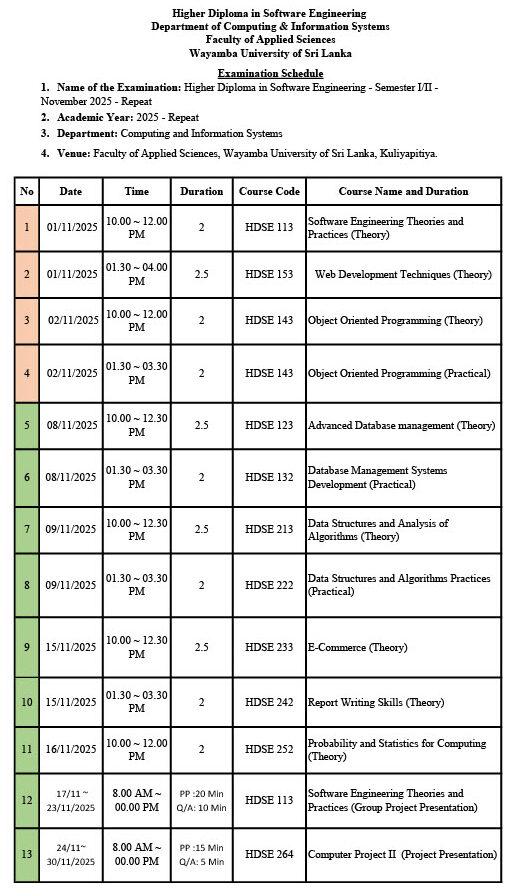 ZNX2urfBR1n9GgvX8 - LMS access to the previous courses will be granted and you are advised to submit any missing assignments to your repeating subjects. Students from HDSE Intake I, II, or III who do not have access to HDSE IV courses: Please send an email to sa.cmis+hdse@wyb.ac.lk with the subject: “HDSE Repeat Examination – Nov 2025”, including your full name and index number.